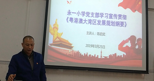 根据坦洲镇组织人事办公室的通知要求,3月25日下午,永一小学党支部在学校多媒体室开展专题学习会,学习宣传贯彻《粤港澳大湾区发展规划纲要》。此次学习会由支部书记陈启武主讲,学校全体党员和教师一起参加了本次学习会。