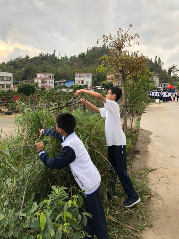 接着,初一年级同学便有秩序、按小组拿好工具开始了劳动。春日暖阳,照射出了老师和同学们的干劲,大家都积极、热情地投入到除草活动中。除草的地点在校园外路边,杂草丛生,荆棘遍地,同学们面对这种场景,丝毫没有畏难情绪,真正显示出了吃苦耐劳的志愿者精神。一场酣畅淋漓的除草劳动,有的用剪刀、有的用铲子、有的用钳子,还有更多的同学徒手拔草,每位同学都配合得相当默契,充分发挥了团结、互助,友爱的志愿者精神。