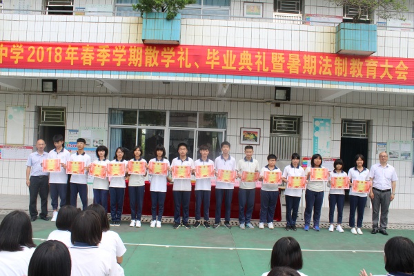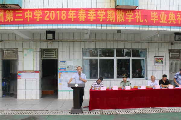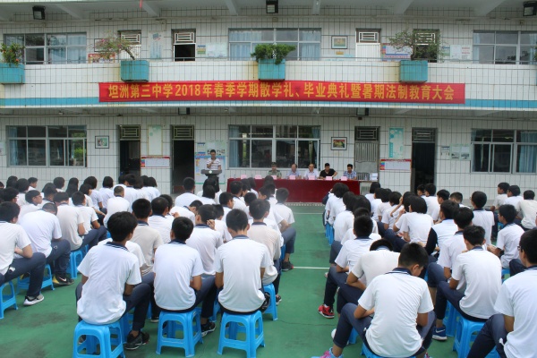 2018年7月6日,坦洲三中在教学楼前举行了2018年春季学期毕业典礼暨散学礼仪式。典礼由校德育副主任彭峰老师主持,坦洲三中全体师生以及坦洲镇磨刀门水上边防派出所林林警官参加了此次典礼。