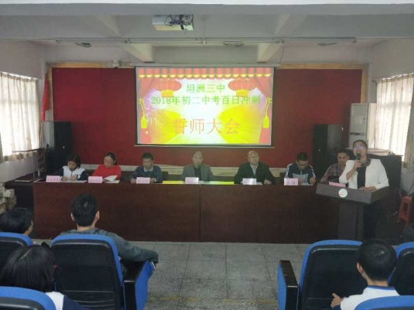 阳春三月,春暖花开。2018年3月13日周二第九节,坦洲三中初二级全体师生在阶梯室隆重举行了“坦洲三中2018年初二地理、生物中考百日冲刺誓师大会”。大会主要分为七个环节:奏唱国歌、观看激励短片、学生代表讲话、教师代表讲话、学生宣誓、郑训彬副校长讲话、学生签名活动。