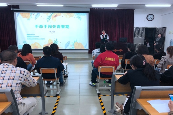 2019年11月22日晚,汇翠学校五年级召开了本学期期中家长会。这次会议分两个议程:第一阶段在多功能报告厅,国家职业指导师、国家高级家庭教育指导师、中山市企业职工服务联合会副理事长叶文芳老师就《手牵手闯关青春期》和家长们进行家庭教育经验的讲座交流;第二阶段回到各班级教室,班主任和各任课教师跟家长作进一步交流。