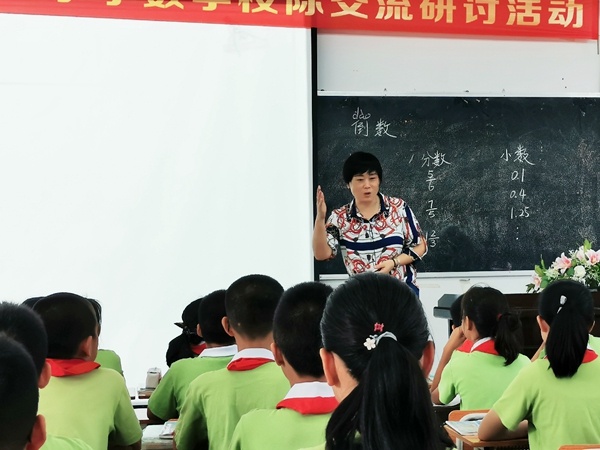 活动当日,由汇翠学校小学数学科组贺红霞老师执教了一节六年级数学常规课《倒数》。贺老师从回忆学过的整数、小数、分数开始,引出对“倒数”的正确读音及理解,抓住概念中的关键信息,循序善诱,引导学生在给整数、小数、分数找出倒数的过程中,不断强化“互为倒数”的意识。