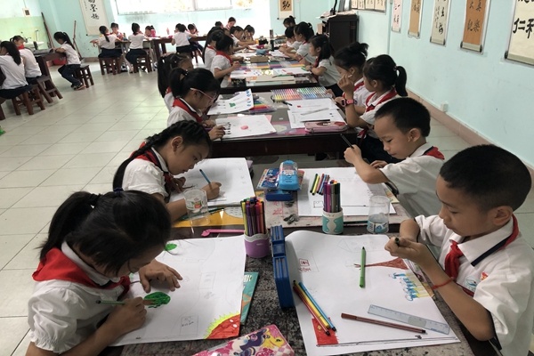 2019年6月14日上午,大队辅导员林玲老师组织二年级学生在书法室进行比赛。整个书法室座无虚席,孩子们拿出早已准备好的美术工具端正地坐在座位上,根据主题要求,孩子们一个个或托腮思考,或低头不语,或会心一笑。片刻后,一幅幅色彩明丽、充满童真的的图画展现在孩子们的面前。有庄严肃穆的天安门,有冉冉升起的五星红旗,还有放飞和平鸽的少先队员。比赛结束,经过评委老师公平、公正地评比,评出了八个一等奖,十五个二等奖,若干个三等奖。在周一的升旗仪式上,大队辅导员林玲老师给孩子们颁发了金灿灿的奖状,为此次活动画上了圆满的句号。