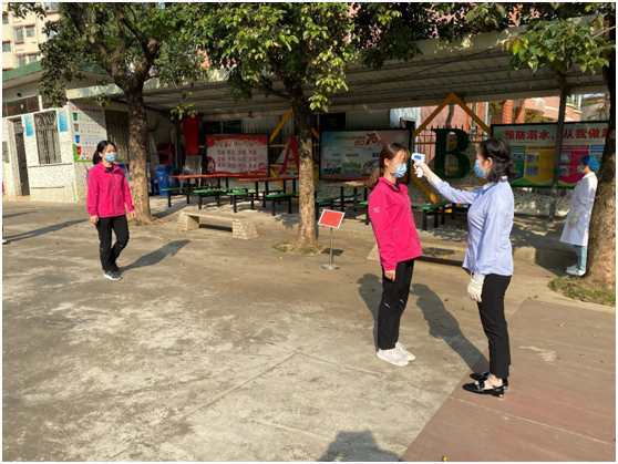 入校晨检,安全有序。进校测温是学校日常防控疫情工作第一站,本次演练就学校校门开放、校外马路的实际情况部署教职工把好这一道安全门槛。为确保学校入校前不发生拥堵、扎堆、聚集等情况,校门口由安保人员和一位值班教师组织学生排好序列队伍,每生之间间隔1.5米的安全距离,一个值日教师进行体温检测,当检测学生体温出现异常时,在无接触情况下,马上将学生安全带至临时隔离室,由校医询问具体情况,并将情况通知班主任及主管行政进行逐层上报,通知家长接回学生到医院就诊。