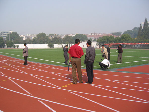 标准塑胶跑道全长400米,跑道的弯道是半圆形,而且最内圈的半径是36米,每条跑道宽1.2米,现有8个跑道。