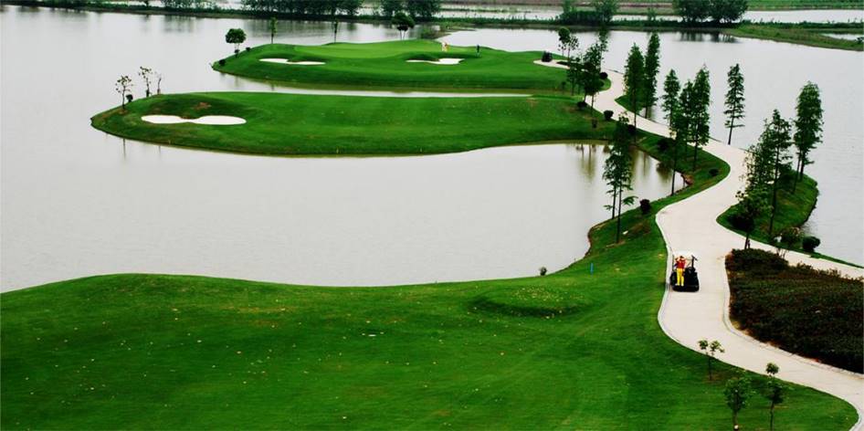 该球场是依据世界高尔夫职业比赛(PGA)标准设计建造的标准杆72杆的18洞高尔夫球场,总占地面积1300亩,水占面积500亩,球道面积800亩,其中沙坑面积14134平方米。每洞至少5个发球台,50米高的天然坡度,6个岛型果岭,6个炮台果岭,72个沙坑,17个洞有水障碍环绕……