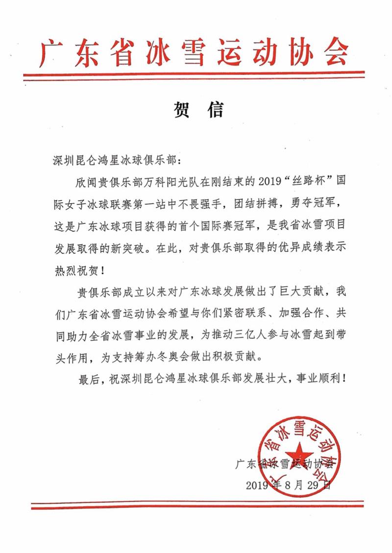 广东省冰雪运动协会向深圳昆仑鸿星冰球俱乐部发出贺信。正文如下: