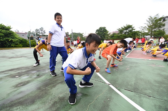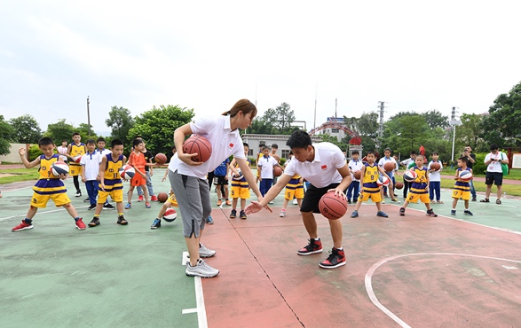 随后,支教课程进入到有球环节。从最基础的原地运球,再到较有实战意义的左右交臂运球、背后运球等,黄文威、陈丽宇亲身示范,狠抓细节,手把手教学。台风将至,天气闷热,篮球场上,冠军教练和孩子挥汗如雨,黄文威不断地重复示范三步上篮的技术要点,陈丽宇在投篮比拼环节激情呐喊,篮球支教以南粤古驿道定向大赛为载体走进阮啸仙红军小学,其意义不仅仅是专业知识的传授,更是把篮球梦带进了这片红色土壤。