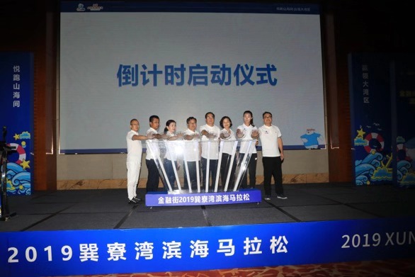 最后,“巽马”组委会进行了赛事倒计时启动仪式,惠州市文化广电旅游体育局党组成员赖成伟,惠东县人民政府副县长杨伟斌,惠东县文化广电旅游体育局党组书记、局长温雪映,巽寮滨海旅游度假区管理委员会主任陈达婷,金融街惠州置业有限公司董事长钱海民,金融街惠州置业有限公司总经理梁成艺,广州博润体育科技有限公司总裁易伟新,以及赛事形象代言人焦安静共同启动金融街2019巽寮湾滨海马拉松倒计时。