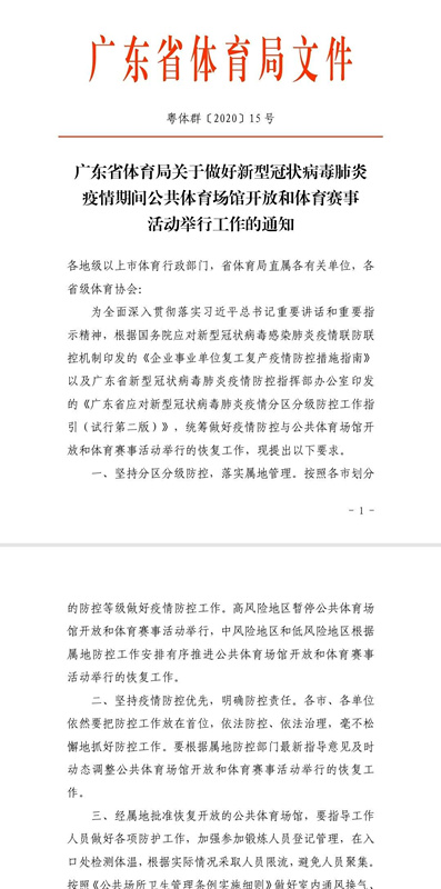 受疫情影响,此前广东省体育场馆全部暂停开放,省体育局发布“通知”的目的,是指导各地根据自身的疫情防控情况,科学、有序推进场馆开放、赛事举办的恢复工作,并强调要落实属地管理。