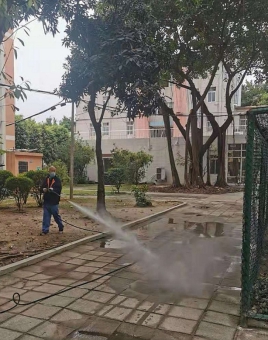 外防输入,内防扩散,中心工作人员每天对场馆营房进行消毒外,还在大门口设置消毒地垫,对所有进入二沙车辆的轮胎、行人鞋底进行消毒。运动员每天接触的训练场地设施卫生保障也及其重要,中心专门安排工作人员每天对所有训练场馆喷药消毒,同时加大院内环境卫生的整治力度,对中心院内环境、宿舍、电梯、道路、绿化等进行无死角喷药消毒。