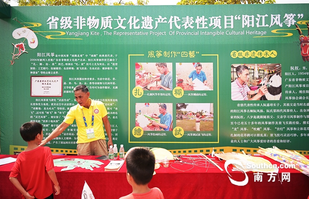 “这是灵芝,待会会有师傅教你怎么做”,在2020年“中国农民丰收节”系列活动暨南粤古驿道定向大赛封开站启动仪式现场开设的“省级非物质文化遗产代表性项目‘阳江风筝’”展位前,阮权正在给围观的家长和小朋友展示制作“灵芝风筝”的精湛技艺。作为省非物质文化遗产阳江风筝项目省级传承人,他表示能在南粤古驿道舞台上展示阳江风筝,将有助于风筝文化的推广。