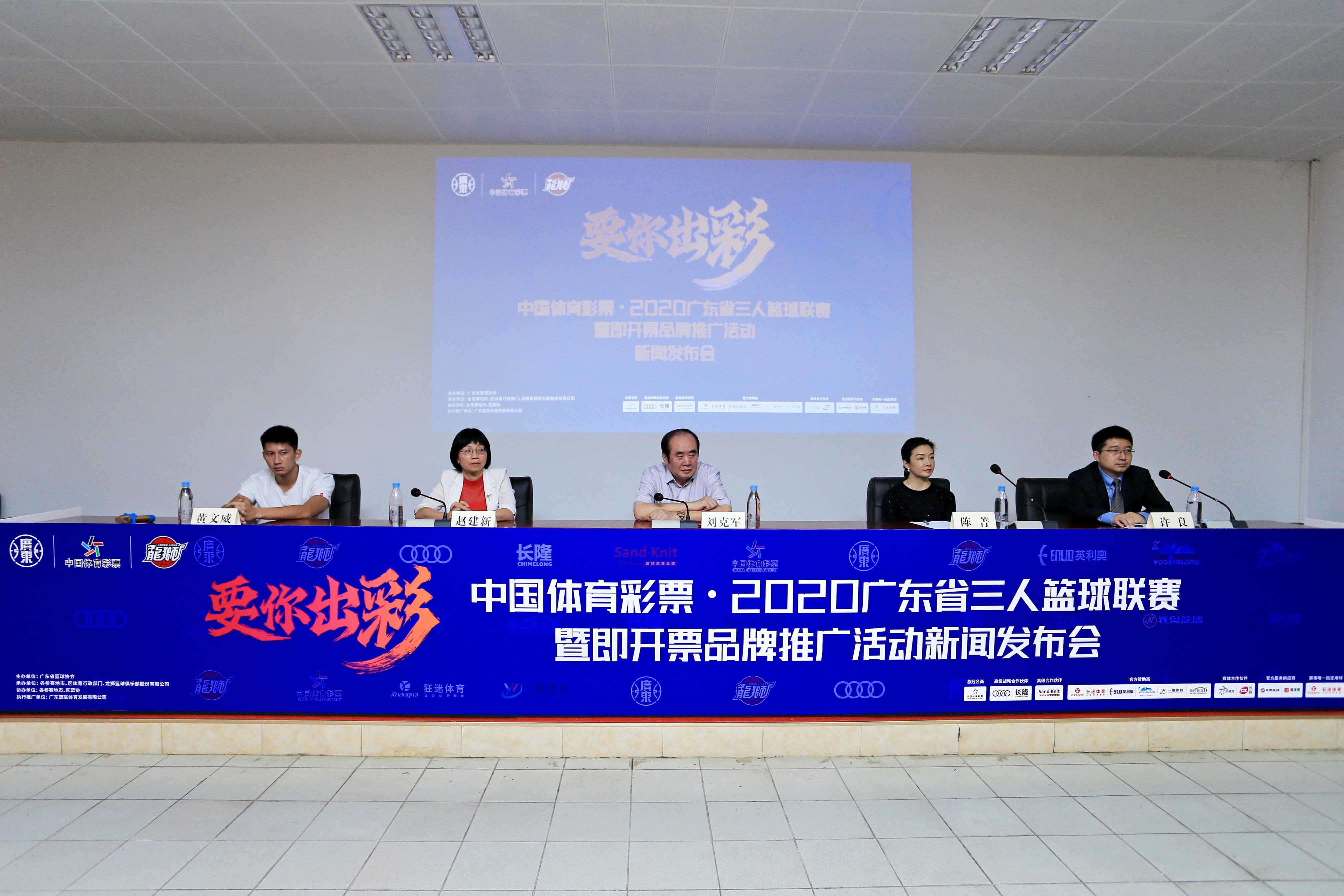 中国篮球协会副主席、广东省篮球协会会长刘克军,广东省体育彩票中心主任赵建新,一汽-大众奥迪销售事业部南部区区域主管市场与公关经理许良,龙狮篮球俱乐部股份有限公司商务运营总裁陈菁,2018年印尼雅加达亚运会三人篮球项目冠军队员、2019 年广东省三人篮球联赛男子组冠军队队员黄文威出席了新闻发布会。