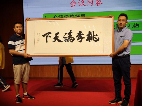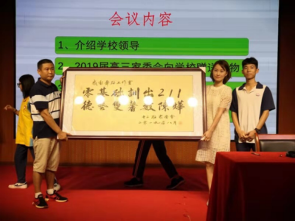 会议首先举行的是赠送仪式。2019届高三家委会代表覃先生向李自可校长赠予题为“硕果累累”、“桃李满天下”的牌匾,表示家委会对学校的感谢与美好祝愿。而“精准教学育桃李,八成学习上本科”“零基础训出211,德艺双馨数陈烨”的牌匾,体现了家委会对学校艺术教育的肯定和艺术班老师的感恩。赠送仪式之后,家委会代表覃先生与艺术教师代表陈烨、校优秀毕业生覃航舰合影留念,整个过程温馨、励志。