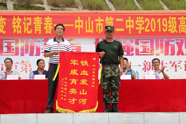 学校对模拟法庭表演学生、军训优秀学员、军训之星、会操表演的优秀班级颁发了奖状,鼓励他们继续努力!学校为中山市武警支队颁发锦旗,感谢武警支队在军训期间的贡献。朱焕章参谋作总结发言。
