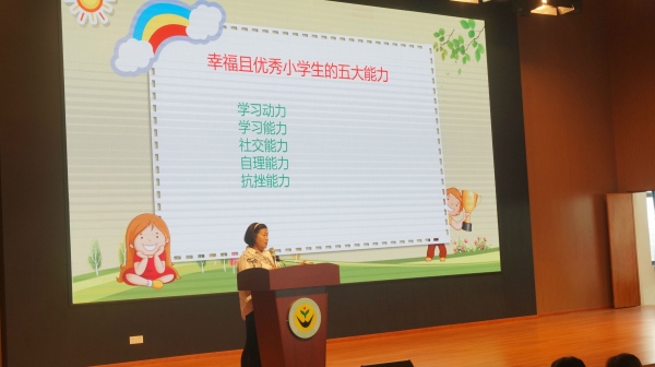 在阶梯室新生家长培训中,叶文芳首先介绍了幸福且优秀小学生的五大能力,包括学习动力、学习能力、社交能力、自理能力、抗挫能力。她通过生动的案例,与新生家长分享了这五大能力的具体内容。然后,她从强化入学的价值、阅读能力培养、书写能力培养、数学思维能力培养、认字训练、专注力培养、交往能力等七个方面向新生家长介绍了如何实施小学生入学能力训练。她深入浅出的分析,活跃清晰的逻辑,引人入胜的语言,让新生家长兴趣大增,积极投入,收获甚丰。最后,学校邀请了二4班邓梓均妈妈袁素芬为全体家长开展主题为“良好的生活学习习惯”的分享。他们两位的讲课和分享让全体家长受益匪浅,部分家长用手机拍下重要的PPT,有些用笔记本记录讲课内容。