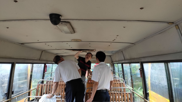 区交警大队警官使用专业仪器检测校车GPS安装情况、核对驾驶员与车辆信息,认真检查安全带、逃生装置和轮胎的配备情况。通过检查,发现校车存在一些问题,当场进行整改,并提醒学校需要在校车显眼处粘贴安全标语。