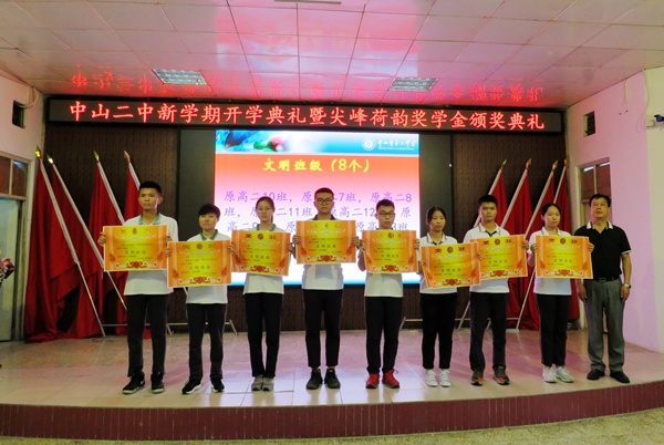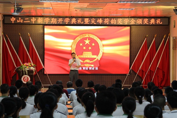 金秋九月,五谷芳香。秋天是收获季,意味着丰收。硕果累累的2019高考刚过去,新的学年又将开启。9月2日上午7时40分,中山市第二中学2019-2020学年开学典礼暨尖峰荷韵奖学金颁奖典礼在学校阶梯室举行,表彰过去一年获得优异成绩的二中学子。典礼由梁红妹副校长主持,吴祥明校长、王曙东副校长、陈福生副校长、侯志坚副校长及部分获奖同学的家长出席典礼。