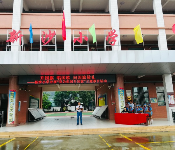 9月2日上午7点多,新沙小学校园处处洋溢着喜庆的气氛,师生们精神抖擞进入校园,叶景乾校长就在校门口热情地迎接同学们并派发小彩旗,为“升国旗,唱国歌,向国旗敬礼”活动做好充分的准备。
