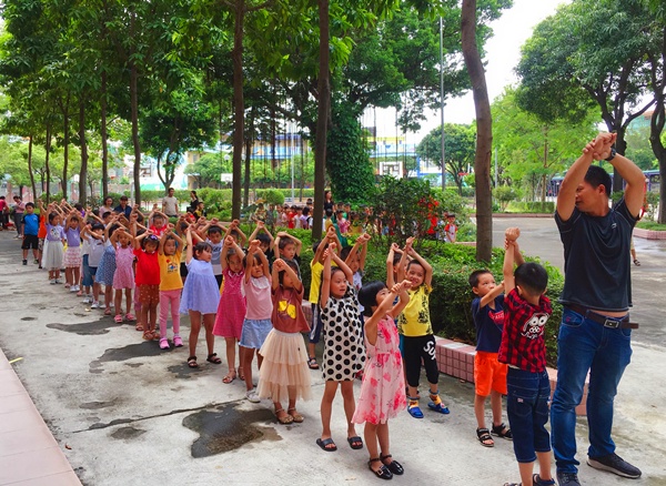 一年级的教师领着学生认识教室和卫生间的位置,教会学生不同情况下的坐姿,例如:静息时、听讲时、准备发言时等。细致地给每一位学生排行进路队时的位置和班上的座位,然后带领学生们练习路队和小口令,深入浅出地、热情满满地教育着孩子们。