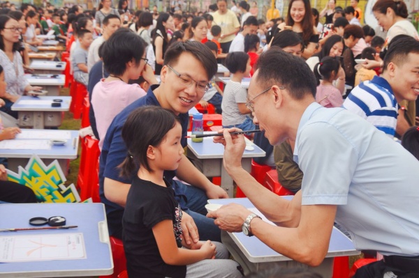 开笔礼的第一个环节是拜师礼,让学生懂得感谢老师言传身教,以师志为己志,施志行道,以谢师恩。第二个环节是朱砂开智,祝福孩子从此眼明心明,好读书、读好书。 第三个环节是击鼓明志,在罗权鎏校长的带领下,全体学生宣读主题语,以此明志。第四个环节是开笔明理,一笔一画写好字、一生一世做真人。家长和孩子们先认真聆听罗校长带来校长第一课“写人字”。接着家长同孩子共同完成“开学第一字”。