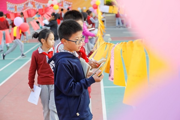 这次游园活动的方案教导处20天前就已公布,各位老师按方案有条不紊地进行准备。共有5个园区,游园项目的设置在去年基础上有所增加,具有鲜明的年段特点。猜字谜、对春联、填诗词、背经典、数青蛙、搭七巧板、趣味成语、生活与数学、英语完形填空……30多个游艺宫精彩纷呈。上午所有题目已挂好,并有一簇簇气球装饰。两点整,各班学生拿着活动记录单和笔进入游艺区,一、二年级园区在香樟园,有10个班的同学参与;三、四年级园区在羽毛球场,高年级园区在阶梯室侧面的凤凰广场。新增的“踢毽子”项目吸引了很多男孩子,赵老师一边指导动作,一边鼓励他们多玩几轮。不一会儿,负责对答案的“宫主”前排起了长龙。有的同学很有策略,专门在自己擅长的某个项目排队答题。有的在“趣味扑克”那儿冥思苦想;有的摇头晃脑数青蛙;有的胸有成竹地背出古诗文或对出下联;有的同学猜出很难的成语,得到“宫主”夸奖眉飞色舞;有些两两合作,一下子答出题目要求的六个成语满意离开;有的因为所选题号已被人答过稍显遗憾随即又投入“战斗”……