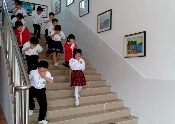 在演练前,向全体教师再次明确《新地中心小学校园安全演练工作方案》,落实责任,细致执行。随着校园内突然响起警报声,随着哨声的命令,各位老师已提前到达指定岗位,带领学生根据应急预案中规定的路线,沿着学校指定楼梯口快速前进,引导楼内学生快速疏散;在疏散过程中,各班任课教师带领学生弯着腰、猫着步,用手捂住口鼻,沿着学校指定楼梯口快速前进,有序撤离到教学楼前小广场。接着各任课教师清点人数,并层层向上汇报,全校师生全部安全疏散完毕。整个过程紧张有序、可操作性强,并收到了预期效果。最后,何建辉副主任向全体师生提出:1、要有安全防范意识;2、要明确逃生路线;3、要掌握逃生的方法;4、积极参加“119消防安全专题教育”。