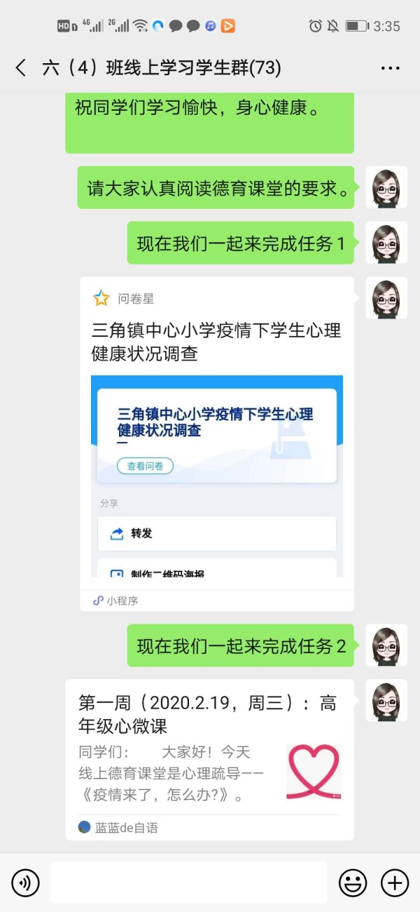这个春节,一场瘟疫席卷了华夏大地,每个中华儿女响应国家号召,共同抗“疫”。三角镇中心小学德育处关注到学生的心理健康,通过线上课堂缓解疫情下学生的心理压力,减轻其负面情绪,调整心态,以达到学生身心的健康成长的目的。