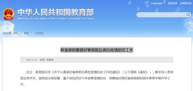 近日,教育部印发《关于认真做好寒假前后高校疫情防控工作的通知》(以下简称《通知》)。《通知》要求,要科学安排寒假放假时间。各地和高校按照当地党委和政府统一安排,坚持省级教育行政部门统筹,根据疫情形势和教育教学进度,因地制宜、因校制宜,优化调整寒假放假时间,安排学生分批次有序放假离校。