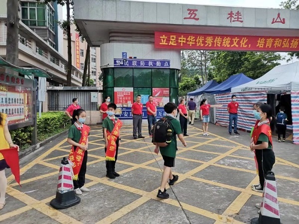 清晨的校园,空气清新,知了声声。在这个特别的复学季,孩子们迈着轻盈的步伐,朝着五桂山学校的方向走去。孩子们胸前鲜艳的红领巾随风飘扬,清澈的眼眸中荡漾着满满的笑意。学校全体行政和值日教师早早分列在学校大门口和体育馆门口,满脸笑容,等待孩子们的归来。五桂山派出所的民警、家委护卫队、礼仪小天使也做好准备,等待孩子们的返校。在小天使的引导下,复学的孩子们沿着学校规定路线,按前后间隔一米的要求,有序地通过体温测试后进入校园。