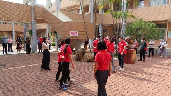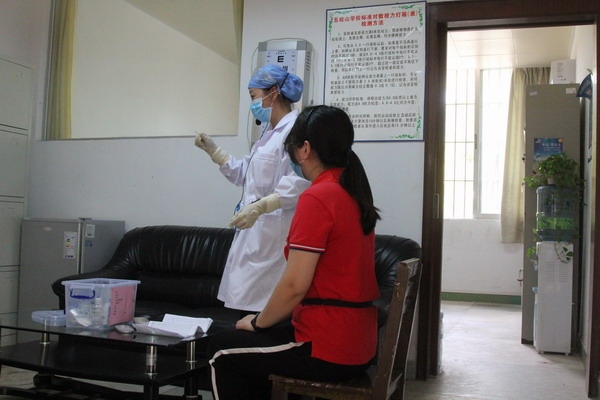 是日下午3:30分,演练开始。第一个预设场景是健康检查演练。模拟学校开学后,在校门体温监测点发现某学生体温异常。值班行政经过再次体温检测确认体温异常,按要求询问该学生,确定学生有与境外疫情重点地区人员接触史时,立刻引导学生进入临时隔离室并联系校医室、班主任。学校医务人员到场后,再次询问学生的“三史”,并用水银体温计对学生测量体温。再次确定学生体温异常后,医务人员立即拨打120通知相关医院派车接诊并上报属地疾控中心。与此同时,医务人员把情况汇报给学校负责人,并上报区教指中心。专业消毒人员最后对相关区域进行消毒。