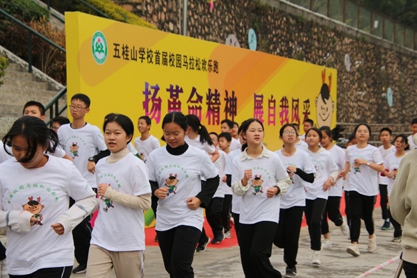 花香五桂,崇文重教,在如歌的岁月里,美丽五桂山学校座落在五桂山的青山绿水间,承载着老区人和客家人希望与梦想。为丰富校园文化生活,弘扬体育精神,锻炼师生意志,提高师生身体素质和“精、气、神”,2019年12月28日,五桂山学校举办了以“扬革命精神 展自我风采”为主题的首届“校园马拉松欢乐跑”。