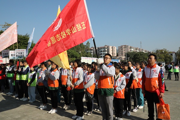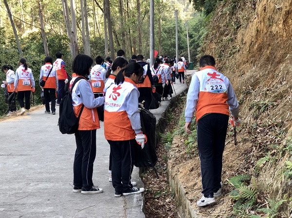 活动当天,五桂山学校团委书记冯锐强向全体志愿者介绍了本次活动的背景及活动内容,强调了本次活动的目的和意义及安全注意事项后,来到五桂山文化中心广场参加活动启动仪式。之后大家乘坐大巴前往大尖山开展环保志愿服务活动。活动中,志愿者们不畏寒风阵阵,拿着钳子、塑料袋,跟着“五桂山学校志愿者服务队”的鲜艳红旗,从山脚沿着上山的路拾级向上,一边清理沿路垃圾,一边宣传保护环境。志愿者们不怕山高路陡,不怕苦不喊累,克服各种困难,小心翼翼地捡拾垃圾,还大自然一个干净。志愿者们的这种无私的奉献精神感动了前来登山的游客,得到了他们的肯定和称赞,都说五桂山学校的志愿者是好样的,很值得学习。