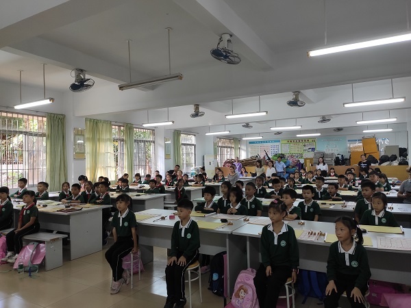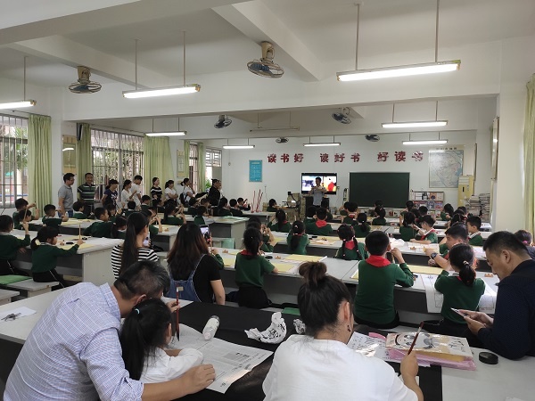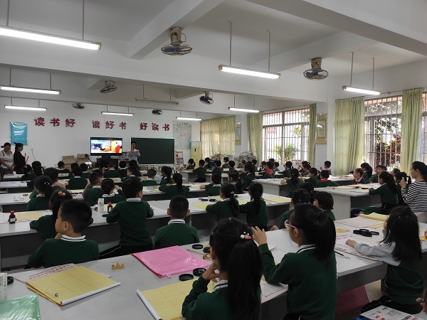 3:30—5:30是黄老师为80名一、二年级小学生的授课时间。黄老师首先给同学们播放了一段视频,视频中的小学生给同学们示范了书法课的课堂常规以及执笔、倒墨、沾墨、刮笔、整理工具的方法。接下来黄老师教同学们学习隶书的横画和竖画,黄老师做示范,学生跟着学,80人的课堂井然有序。