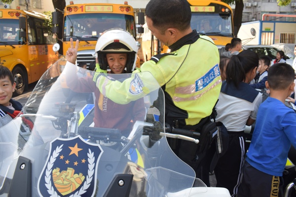 首先,交警大队陈春易警官为同学们带来了一堂生动的交通安全教育课,在课堂上,陈警官从出行安全、安全过马路,乘坐合规合法车辆、遵守交通信号灯、不违反交通规则等方面对学生进行了详细的讲解。交警大队谢景世指导员也对同学们做了强调和要求,他希望同学们要认真学习交通安全知识,将遵守交通规则的宣传带回家,让每个家长都能加强交通安全意识。上完课后,接着进行的是“小小交警活动”,教同学们认识、学习交通指挥手势。交警铁骑队员为现场的同学们展示并带领学习交通指挥手势,教同学们学习、认识交通标志,让在场的同学们体验交警的工作职能,认识并遵守各类交通指令。