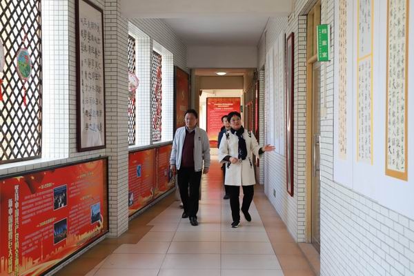在霍熔坪书记的带领下,廖诚书记分别参观了一楼的诗礼展厅和始兴书院。随后重点参观了刚刚揭幕的学校党建文化长廊、教师文化长廊和艺术长廊。从小导游和霍熔坪书记的介绍中,大家了解到学校秉承“依托党建、立德树人”的办学理念。在学校114周年校庆之际,全新打造了“三廊一厅”,这正是学校重视长远发展、教师专业成长以及学生全面发展的最好体现。廖诚书记一边琢磨着党建文化长廊上的内容,一边赞赏其展示形式颇具创新性;一边饶有趣味地欣赏着师生的书法、绘画、篆刻、手工制作等作品,一边不断肯定学校近年来在艺术教育上所做出的成绩。就用他的一句话概括曰:“ 红色文化有特色,艺术文化很突出。 ”