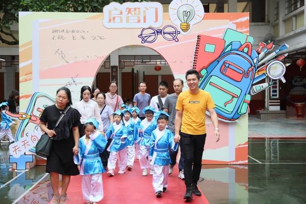 上午9点,伴随着热烈的掌声,一年级的家长代表牵着孩子们的手,踏上了象征着希望、活力、健康、幸福的红地毯,走过七彩启智门,加入了滘口小学这个有爱的大家庭。“启智门”寓意开启智慧之门,孩子们将从这里跨出人生的第一步,去思考,去探索,向着更高更远的方向迈进。他们正式成为一名光荣的小学生了!这一刻,孩子们笑靥如花,快乐洋溢在脸庞,自信从眉宇间飞扬,幸福与骄傲在心底流淌……