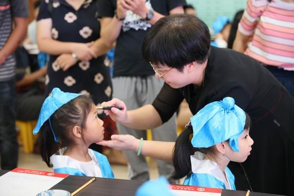 额点朱砂启智慧——阵阵古琴曲声中,家长、老师们擎起朱砂笔,师生携手启迪智慧, 轻轻一点,一个个鲜红的圆点印记在孩子稚嫩的额头上,多么明亮,多么鲜艳。