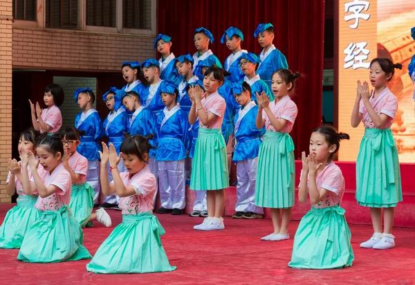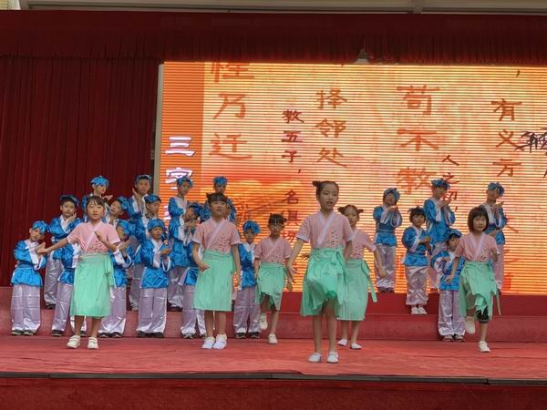 “人之初,性本善。性相近,习相远。”台上在以歌舞形式向师生传颂《三字经》的同学个个穿戴整齐,男生是古时儒生打扮,正摇头吟唱,声情并茂,女生身穿襦裙翩翩起舞,轻盈如燕,朗朗书声和优美舞姿生动地展示了《三经字》的精髓所在、文化内涵。