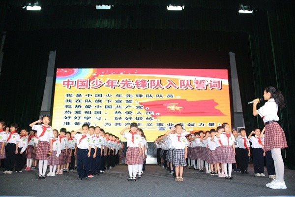 首先进行的是一年级新生入队。他们满怀憧憬,在辅导员们的祝福声中,戴上了鲜艳的红领巾,成为光荣的少先队员。他们望着胸前最活泼最亮丽的色彩,那是队员们最温馨的精神家园和健康成长的摇篮。他们在队旗下庄严宣誓,他们满怀豪情,向伟大的少先队致以崇高的敬意。