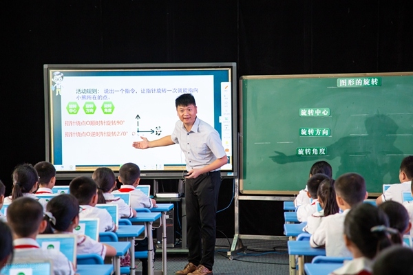 首先,由九洲基小学的黄景锋主任执教了《图形的旋转》一课,黄老师在课堂教学中借助一体机、学生平板,充分运用了希沃白板5中的板中板、蒙层、课堂活动、投屏点评等信息化技术,运用读书郎智慧课堂的截屏投屏、生生互评、教师评价等功能,激发起学生的学习兴趣,实现了课堂上的师生互动,让课堂变得更为活跃、更加高效,实现了信息技术与学科教学的完美整合。