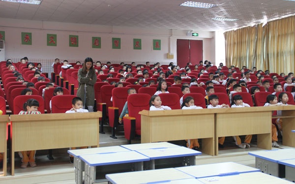各参赛队伍在了解比赛规则了之后,比赛就开始了。一年级的小朋友们各施其技,搭出各种各样形状的纸牌,然后再小心翼翼地把书本放在搭好的纸牌上。但是有些队伍在放书本的时候,不小心把搭好的纸牌推到了,必须要从头再来,可小朋友们也没有气馁,更是同心协力地继续比赛。而看台的同学则屏住呼吸,生怕发出一点点声音就会让赛场上的纸牌倒掉。比赛的最后,一(2)班的C组参赛队伍以在纸牌上放上了18本书的成绩胜出比赛。