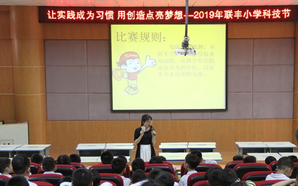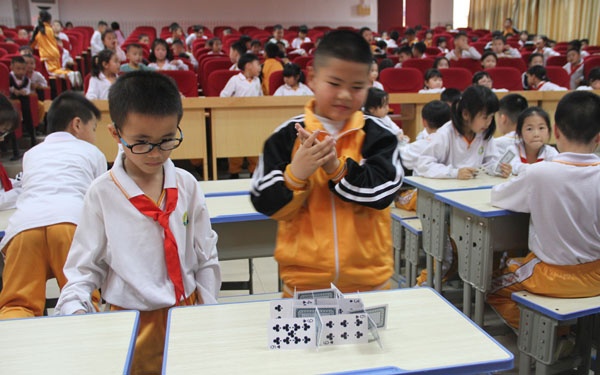 阳光明媚,春风和煦。在这舒服的天气里,中山市小榄镇联丰小学一年级的小朋友利用大课间时间进行了一场有趣的、以“小纸牌,大力量”为主题的科技竞赛活动。