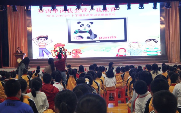 颁奖礼伊始,邱贤芳副校长结合“英语单词我会读,我能背”的主题,跟学生玩了个看图说单词的小游戏。现场千余学生看图大声说单词“panda, tiger, watermelon, hamburger, China, Chinese…”齐声跟读“We are Chinese. We love China.”“ We can read, we can write, we can recite. English is easy. English is fun.”带出浓浓英语学习氛围,现场气氛活跃。