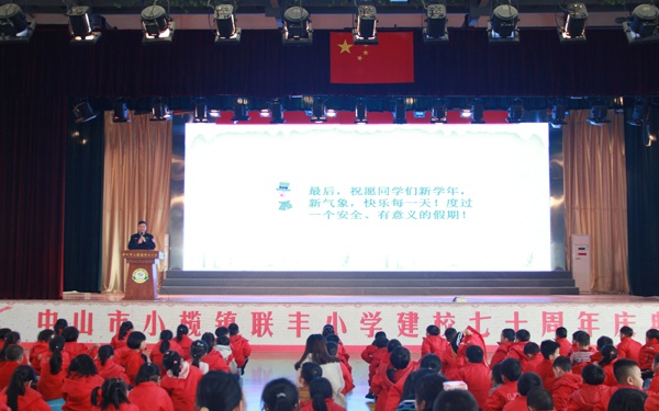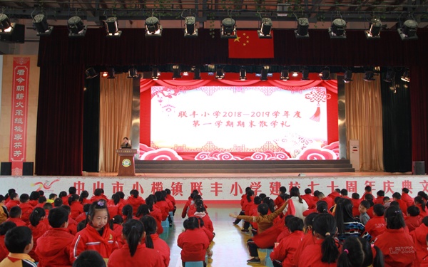 忙碌而又充实的一个学期结束了,2019年1月18日上午,中山市小榄镇联丰小学散学礼在学校体育馆隆重举行,参加会议的有联丰社区党委书记关顺景先生、副书记冯玉玲女士、联丰社区妇女主任,联丰小学法制副校长朱文斌警长、全体师生、全体行政和家长代表。