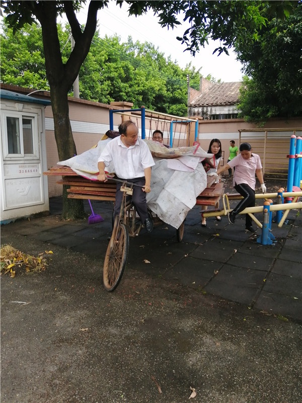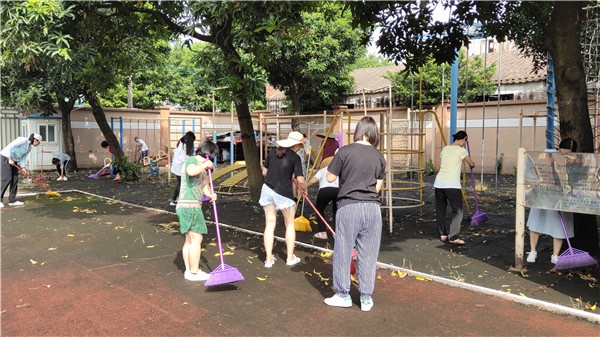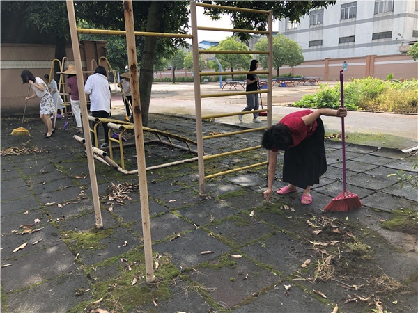 前期,后勤组长梁润辉老师利用暑假疏通地下水道,清理积水,联合社区进行驱蚊灭蚊工作。今天,谈校长首先撸起袖子清理操场废弃堆积物,给全校教职工起到了模范带头作用。接着,全体教职工分工明确,有的负责把树下堆积的落叶扫成一堆,有的负责将操场的杂草拔除。有的负责将垃圾扫进垃圾铲进垃圾车,有的负责将操场的杂物一一清理……。在全体教职工齐心协力的劳动下,将校园室内外卫生进行了全面打扫,清理卫生死角,清除积水和杂物,营造出美丽绿色干净的校园环境。