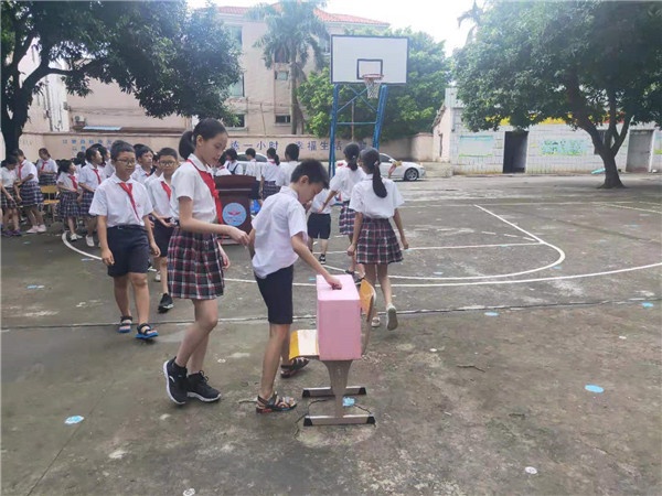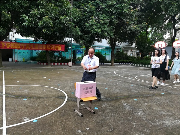 散学典礼最后的环节是响应“广东扶贫济困日活动”,组织全体师生进行爱心捐款活动。一张张承载着老师们和同学们爱心的钱币被投放到捐款箱里,捐款箱笑了,老师们和同学们也笑了。
