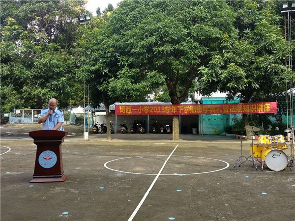 在雄壮的国歌声中,五星红旗冉冉升起。同学们以标准的队礼向国旗致敬,送别2018学年春季学期。今天是假期生活的起点,也是学校和老师们牵挂的起点。如何让学生过个安全快乐的假期,学校法制副校长钟警长从“家具安全”“交通安全”“法制知识”“宪法教育”“扫黑除恶”“扫黄打非”等方面对同学们进行教育,钟警长举出一个个鲜活的例子,全体师深受教育。