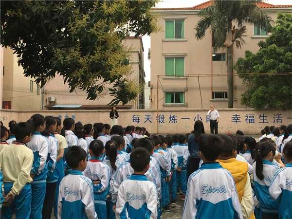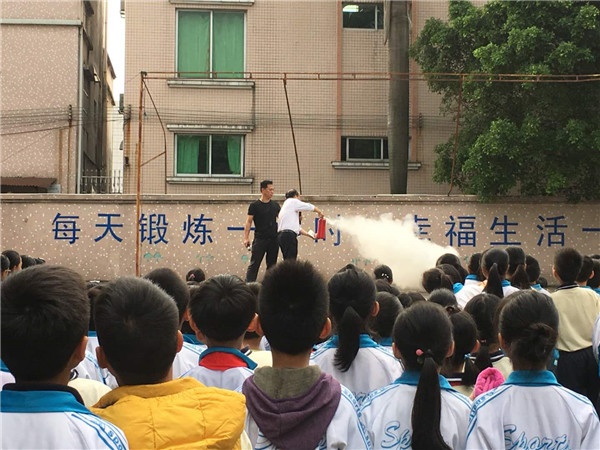 演练结束后,有学校谈炳泉校长即场对全体师生进行“火灾逃生的知识和技能培训”。谈校长从“野外发生火情”“室内发生火情”“校内发生火情”三方面向学生详细讲解了如何应对和逃生。随后还向全体师生展示了如何使用灭火器来灭火的技能。学生听得认真,在谈校长边讲解边示范的讲解中,进一步提升师生们遇火情时的应对技能,增强了师生们的安全意识。