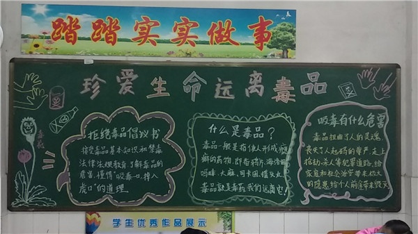 本次活动,既让同学们进一步认识了毒品的危害性,增强了禁毒意识,构筑起了校园毒品预防教育的“防火墙”,又锻炼了同学们创意、书写、绘画、收集材料等多种能力,培养了学生健康的生活情趣和社会责任感,让学生健康,阳光,快乐地生活和生活,发挥了德育教育的职能。